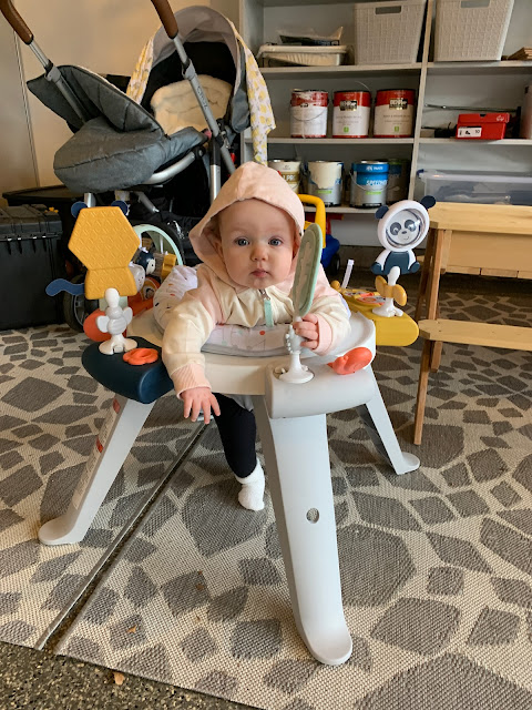 Ivy loves to play. She really enjoys teether toys still and adores her little "command center" activity standing toy. She spins around in that thing and engages with all the features. We call it a command center because when she plays in it she acts like she has a job to do and in charge of some really important task. She also likes the jumper toy. She is rolling back to tummy pretty consistently but hasn't figured out how to roll tummy to back yet. She can sit unassisted but only when she wants to and will regularly arch and stiffen her legs to avoid sitting if she would prefer that you hold her in a standing position.