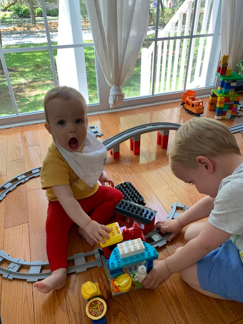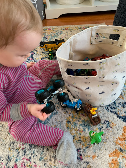 Ivy loves to play. This month with increased mobility she really discovered toys. She LOVES Kip's trains and cars and has figured out how to make them move. She is great at stacking things or putting smaller things into larger things. She tries to do LEGOS and Magnatiles and really pays attention to what Kip does and imitates him. She gets into Kip's stuff a lot and gets into quite a lot of trouble with him. Sometimes Kip will squeal with delight "Ivy is playing trains!" when she does something successfully with his track but if she messes it up she hears it. But, Ivy stands up for herself when Kip takes things away and she will often scream back in his face or attempt to bite him. Woah, the dynamics between these two is something else. She is getting really close to walking and loves to move around the room with the assistance of anything she can use to stabilize herself. I'm really excited for some of the gifts she got for her birthday as she is definitely moving on from her baby toys.